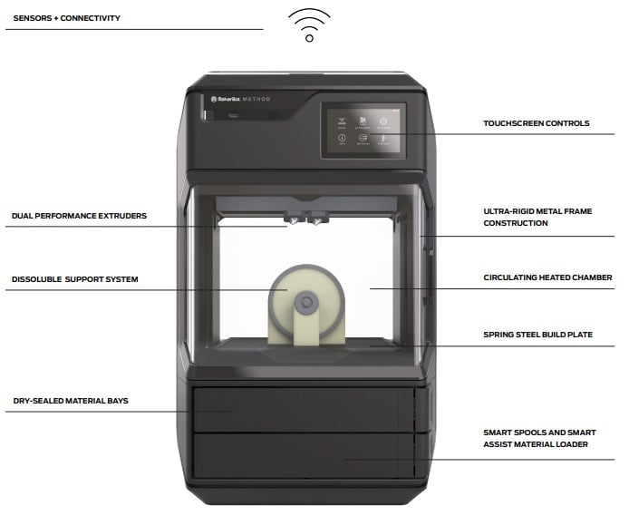 | Features | Closed working chamber heated with circulation to 110 °C. Maximum extruder temperature 300 °C. Sealed compartments for dry storage of materials. Precision soluble substrates. Heavy-duty frame that eliminates vibration and body deformation. Modular Dual Performance Extruders. 21 built-in sensors and automation functions. Remote monitoring and control by Wi-Fi. 25 compatible CAD file types. 5-inch full color capacitive touchscreen. Over 300,000 hours of reliability testing on over 150 printers. |